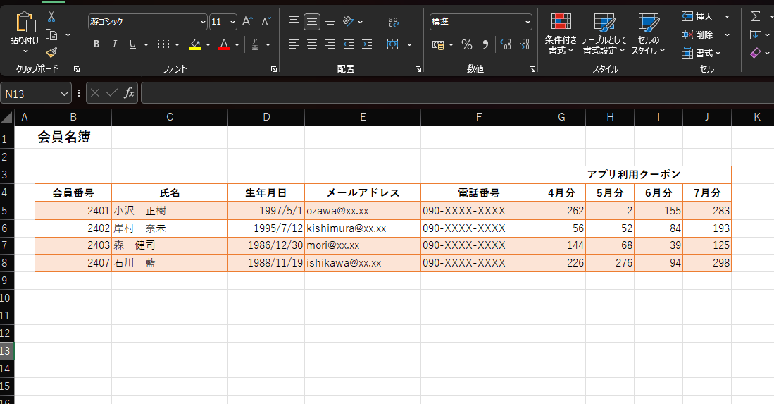 4名の方に、ランダムにクーポンを振り分けるために、RANDARRAY関数を使用します。